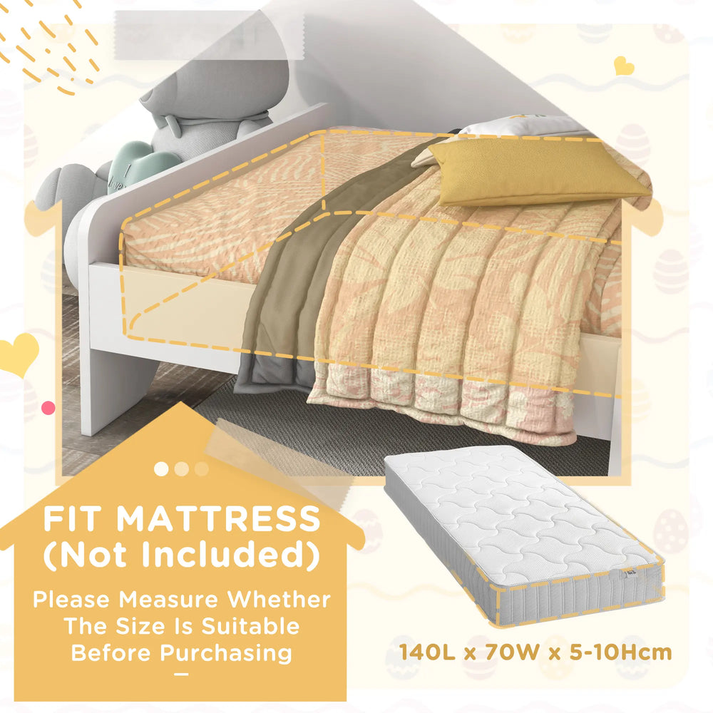 Uplift your child's space with this enchanting ZONEKIZ kids bed. The bunny design creates a world of magic, igniting their imagination. Crafted from solid MDF, designed to support active toddlers. Its low height guarantees easy access, whilst the side rails ensure safe and secure sleeping. Nice and compact, it seamlessly fits into any room. A wonderful bed for kids, elevating their bedtime experience, ensuring a smooth and enjoyable transition to independent sleeping.