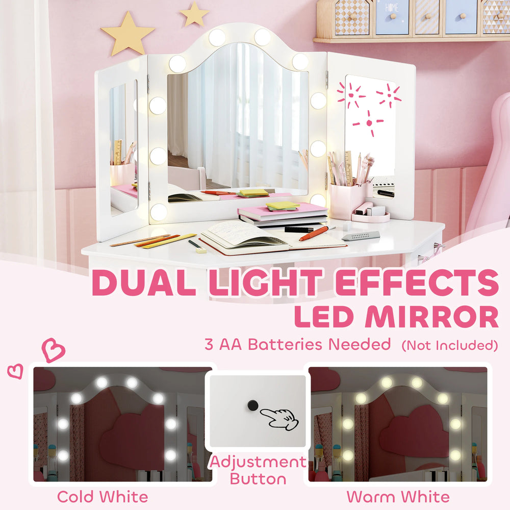 AIYAPLAY Kids Dressing Table and Stool Set, Girls Vanity Table with 2-Colour LED Lights, Tri-Folding Mirror, White