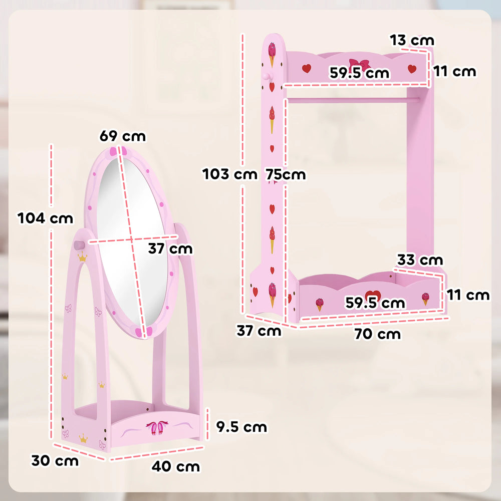 AIYAPLAY Kids Clothes Rail, Kids Dressing Mirror with 360 Rotating, 2 Piece Kids Furniture Set with Storage Shelves, Pink