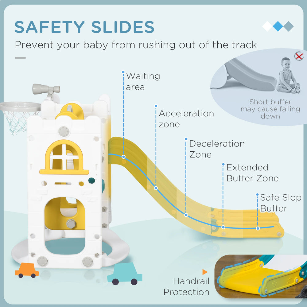 AIYAPLAY 6-in-1 Swing and Slide Set, Kids Playground with Basketball Hoop, Telescope, Storage Space - Yellow