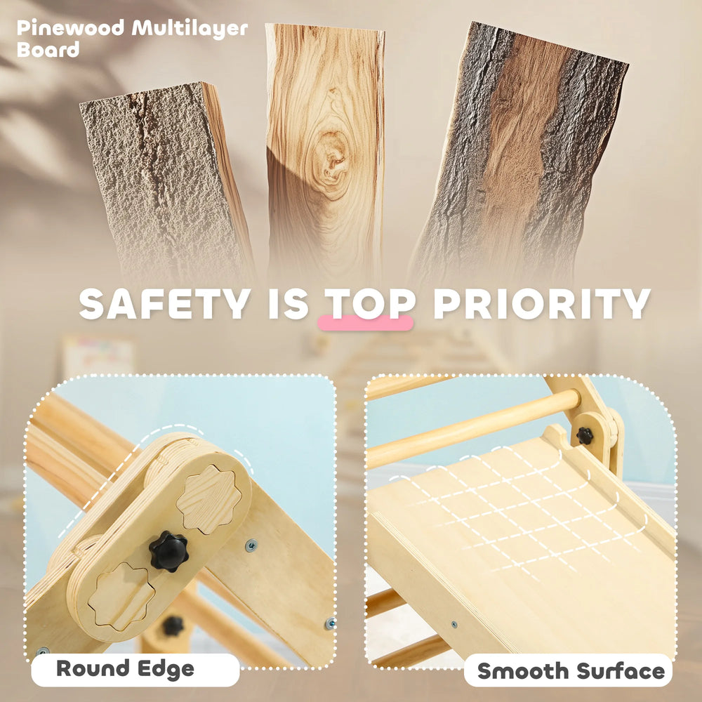 Turn your home into a thrilling play area with the AIYAPLAY 3-in-1 toddler climbing frame! This adaptable pikler triangle set includes an adjustable ladder and a reversible slide that doubles as a climbing wall. Crafted from safe, smooth multi-layer pine wood, this foldable climbing frame is easy to store. Suitable for energetic kids, it enhances motor skills while providing endless entertainment.