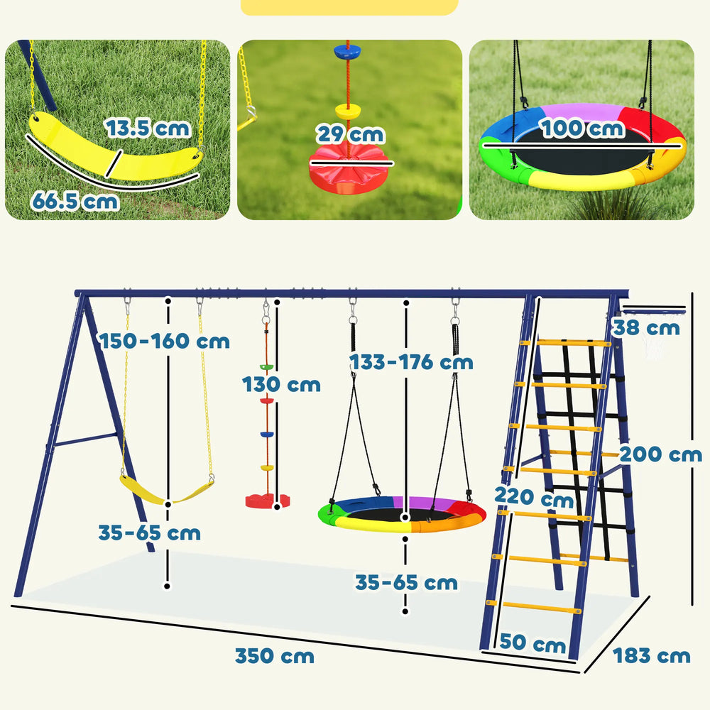Transform your garden into a thrilling play zone with the AIYAPLAY swing set! This versatile six-in-one design features a belt swing, nest swing and disc rope swing, plus a climbing net and frame, all topped off with a basketball hoop. Crafted from robust steel and vibrant, fade-resistant fabric, it's a wonderful outdoor swing for endless fun and adventure for up to four children.