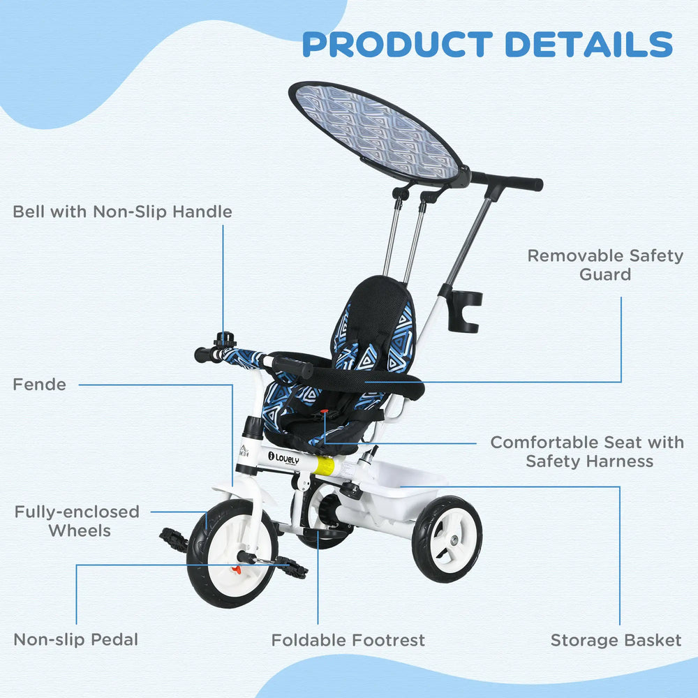 HOMCOM 6 in 1 Tricycle for Kids with 5-point harness straps, Removable Canopy, Blue