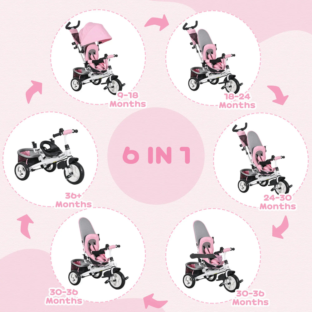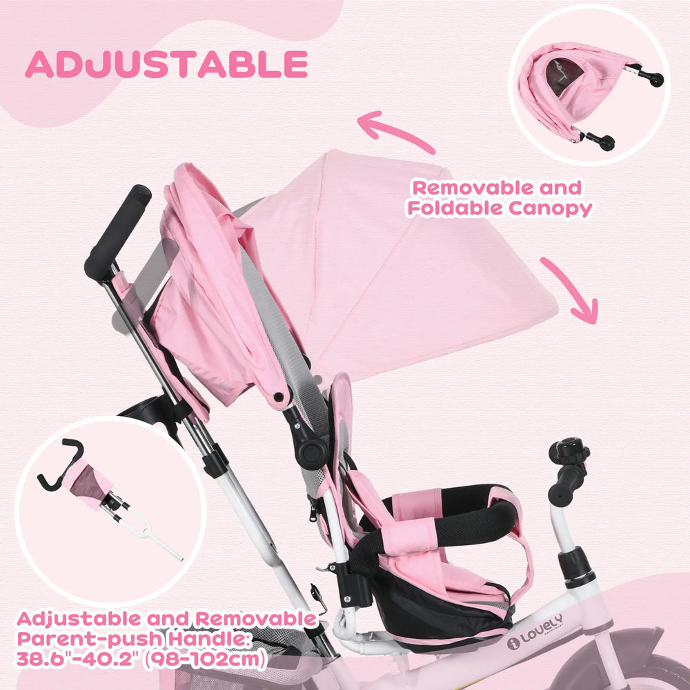 HOMCOM 6 in 1 Kids Trike with Parent Handle, Canopy, 5-point Safety Belt, Storage, Footrest, Brake, for 1-5 Years, Pink