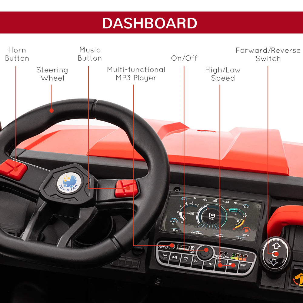 - Realistic: This kids ride on car includes a music player, LED headlights, viewing screen and a working horn everything you'd expect in a real vehicle. Also includes a back bucket for children to keep toys.