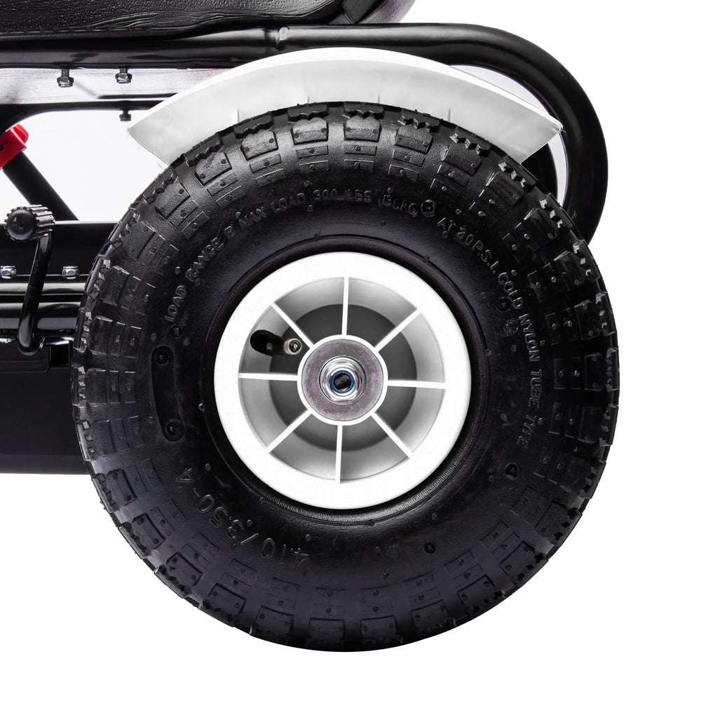 - Inflatable rubber wheels with a suspension system, ensuring the ride is smooth