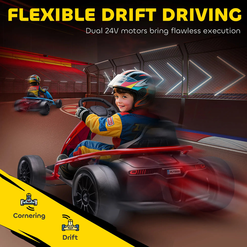 - Real Drift Experience: Kids can quickly brake or accelerate by depressing the pedals thanks to a potent 24V dual-drive motor. Little drivers can maneuver the kids go kart to perform drifts and cornerings. The maximum 13km/h speed provides a more realistic drifting experience because it is faster than an adult's fast run speed.