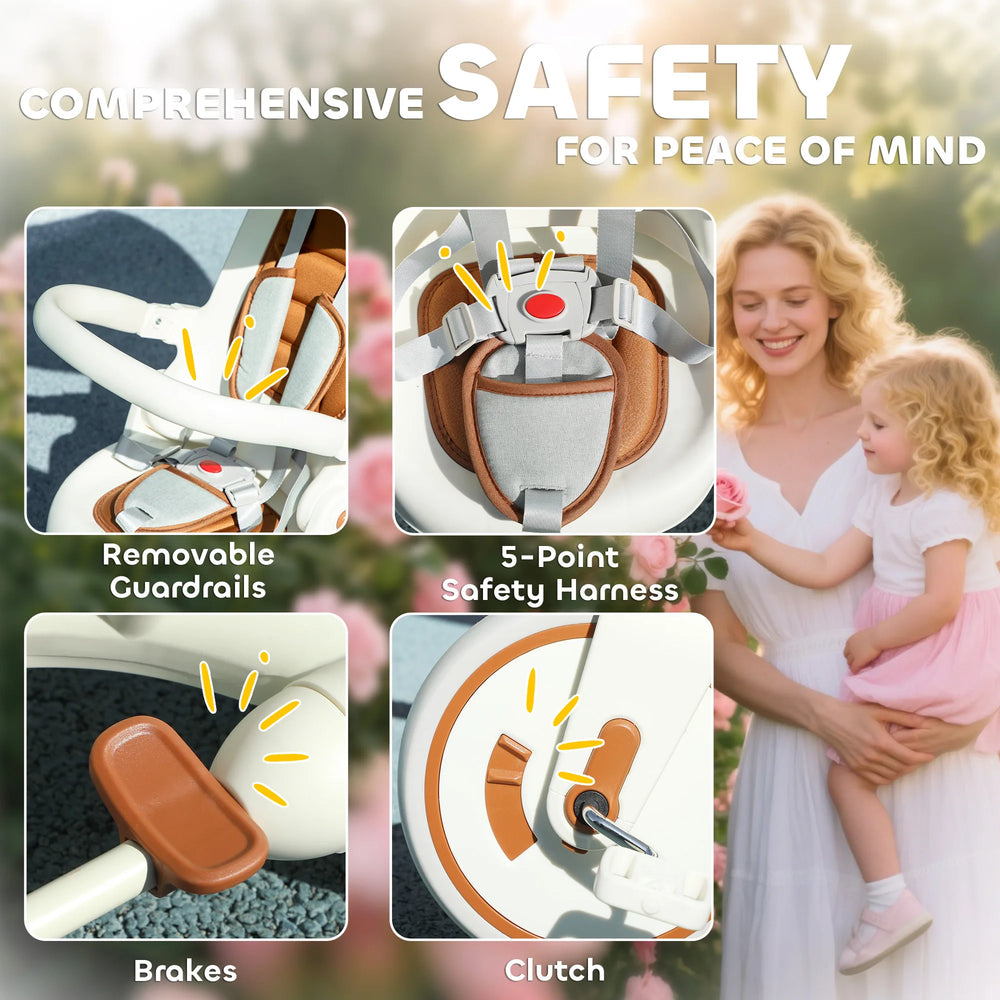 - Security features: With a five-point harness, removable guardrail, one-touch dual brakes and clutch, this trike keeps children secure. Rust-resistant aluminium alloy and reinforced PP provide secure, happy outdoor rides every time.