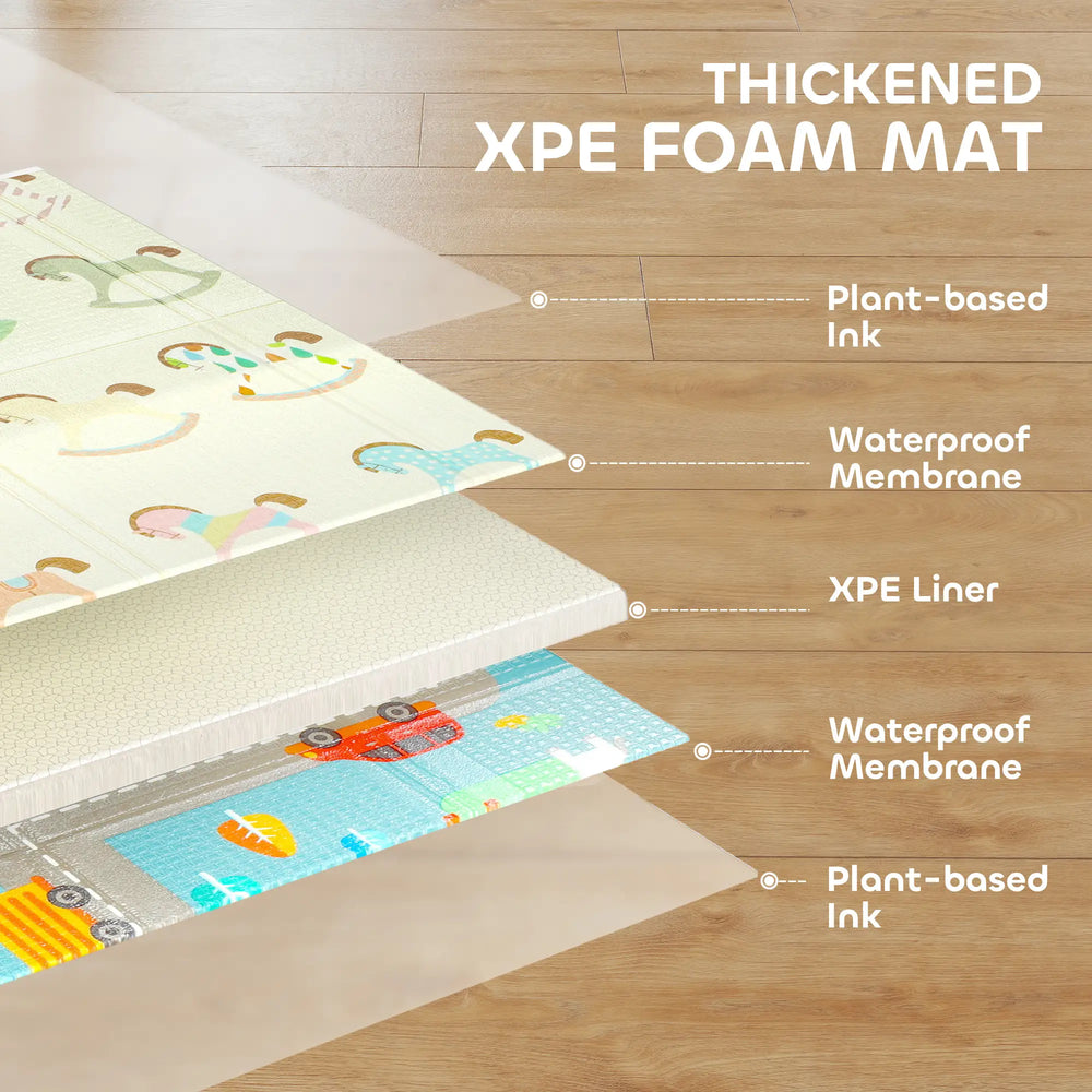 The AIYAPLAY foldable baby mat provides a comfy, secure place for little ones to play and explore. One side showcases a playful traffic road design, great for mini car adventures, while the other side features vibrant rocking horses. Made from gentle, soft foam, it helps cushion first steps and tummy time. This lightweight, foldable mat is easily stored and suitable for family outings, providing safe and fun playtime wherever you go.