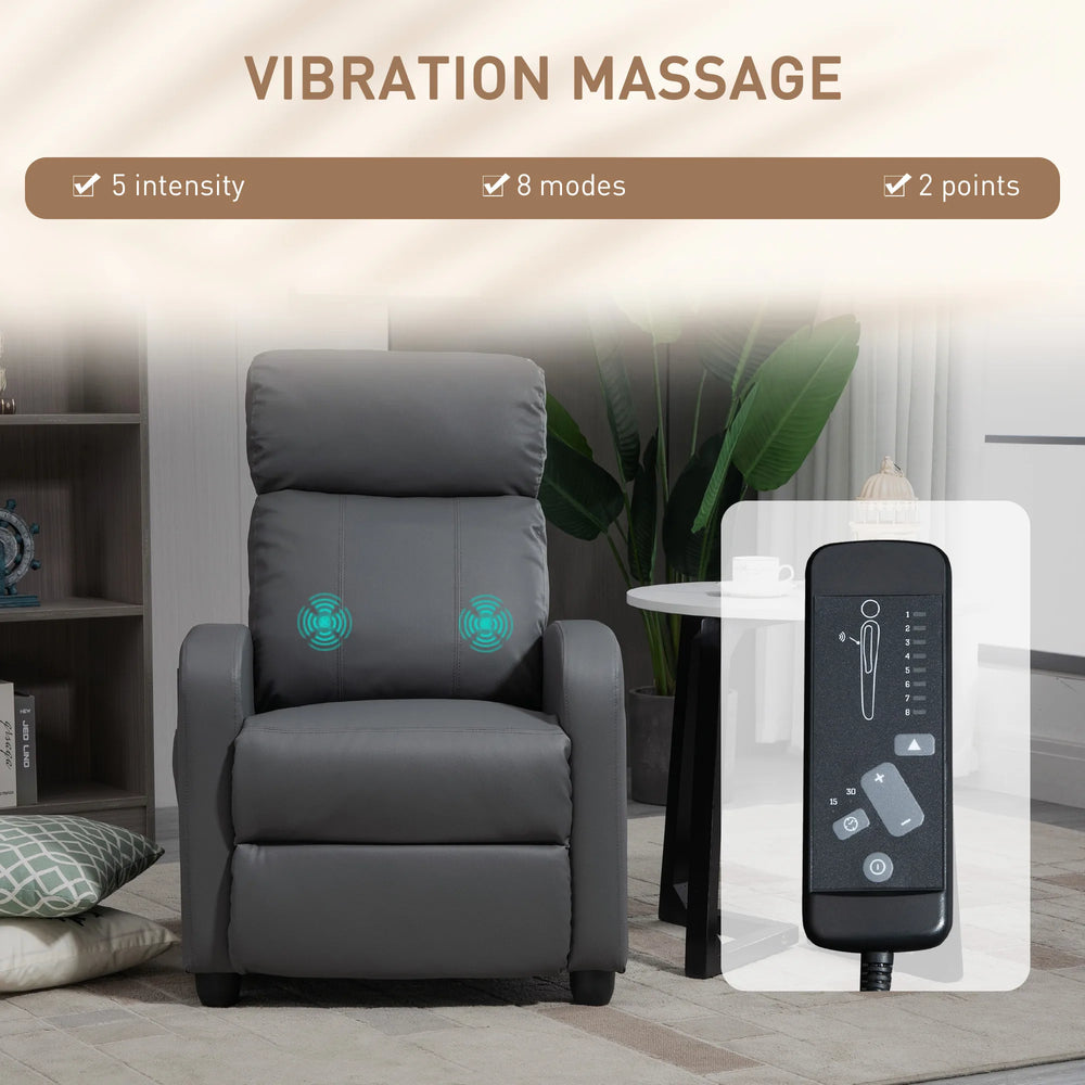 HOMCOM Recliner Armchair, Massage Faux Leather Push Back Reclining Chair with Adjustable Leg Rest, Side Pocket, for Home Living Room Theatre, Grey is backordered and will ship as soon as it is back in stock.