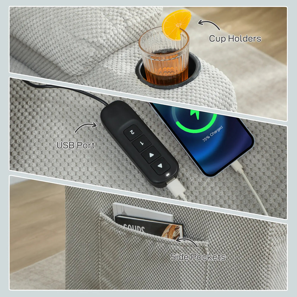 Settle into comfort made for everyday living. The massage recliner blends 8-point vibration massage with gentle lumbar heat to ease tension through your whole body. With its quiet brushless motor, smooth reclining and convenient touches like a USB port, cup holders and side pockets, the HOMCOM recliner armchair creates a cosy spot where you can relax, recharge and enjoy simple moments at home.