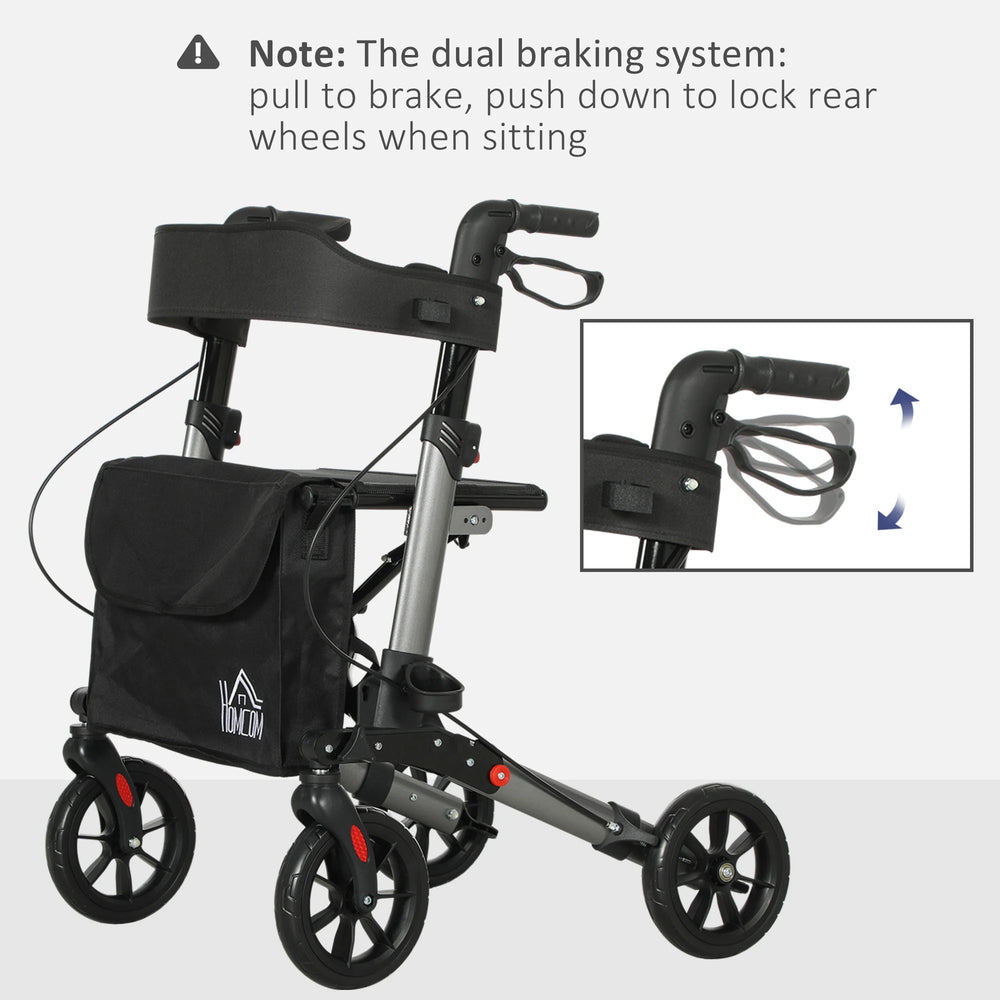 This HOMCOM lightweight rollator walker rolls with you, making journeys stress free. A powder coated aluminium frame for a strong, yet lightweight core, it is fitted with a seat so you can take a break whenever you want. It can be folded into a smaller size for convenient storage and transport. A storage bag to take small essentials with you on the journey. Four wheels for smooth movement, this mobility walker is complete with a dual brake for safety.