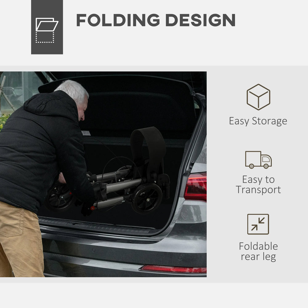 - Foldable aluminium frame: Powder coated for extra strength. A tough and supportive core for this 4 wheeled walker. Foldable to carry and store easily