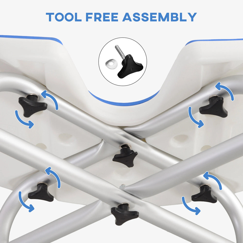 - Aluminium frame: Shower stool has a strong and supportive core. Metal is naturally suitable for wet environments. Under seat cross base for extra support when you sit