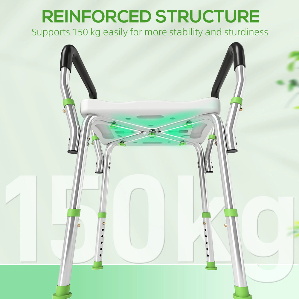 - HDPE seat with EVA cushion: The rubber-like surface on bathroom stool is comfortable, and won't get too hot. Two padded armrests helps provide grip and relieves arm muscle fatigue. Drainage holes prevent annoying water build-up.