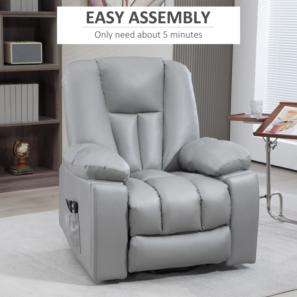 For that little help moving in and out, along with soothing your body whenever, choose this HOMCOM massage power lift chair. The 45 lifting seat lifts you up and lowers you down gently - great for the elderly and those with injuries. The 135 reclining back and footrest means total body relaxation. Features eight vibrating massage points - four modes - to soothe any body aches. Recliner chair finished with faux leather upholstery for a sleek, stylish look.