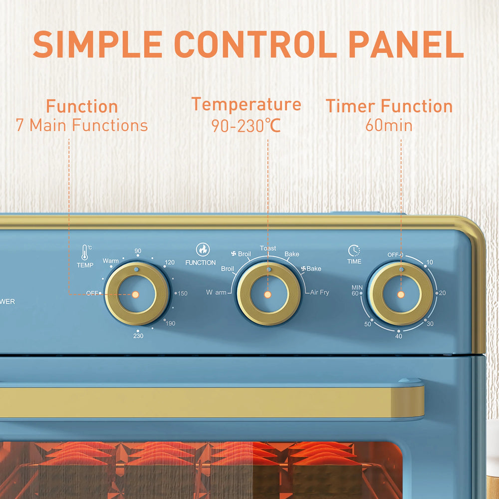 - 90-230C temperature, with seven functions: Set this table top oven to a heat of your choice. Switch between warm, broil, fan broil, toast, bake, fan bake and air fry. So many options for the great cook, every time.