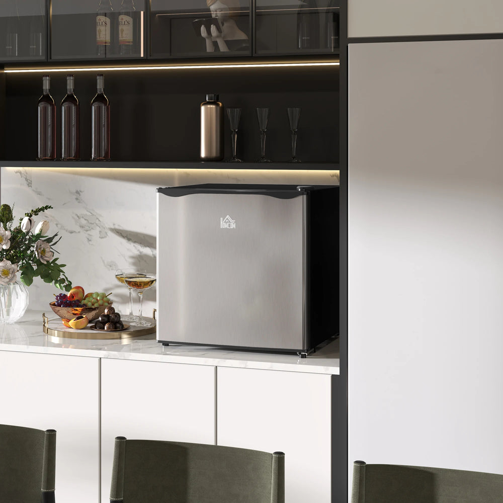 HOMCOM 46 Litre Table Top Mini Fridge, Small Fridge with Ice Box, Reversible Door, Adjustable Temperature and Legs for Bedrooms, Home Office, Silver Tone