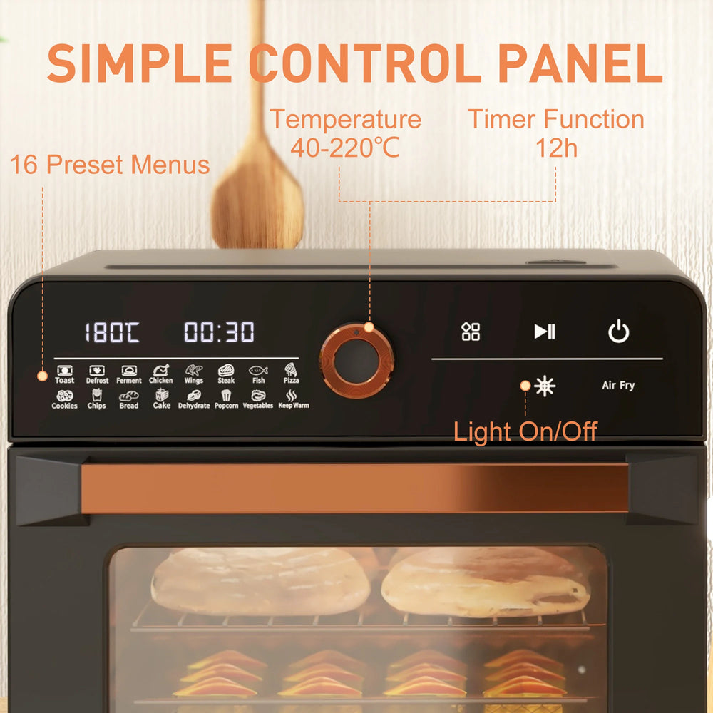 - 40-220C temperature, 12h timer with 16 presets: Set the heat and cooking time of the table top oven to your choice.