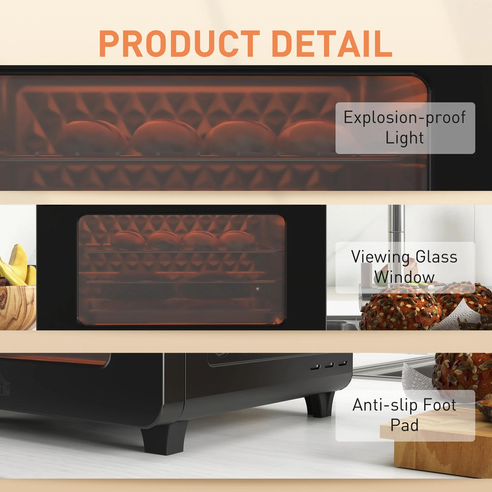 Retro style for the everyday: this HOMCOM convection oven is a piece to love using and having in your home. The black colour, chrome accents and slight boxy shape gives it an old-school look with a modern twist. Adjust the temperature between 40-220C easily, the thermistor control enables fast, precise closed-loop temperature control. Multifunctional design with 16 presets.