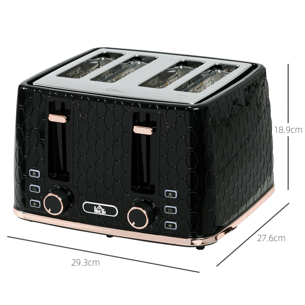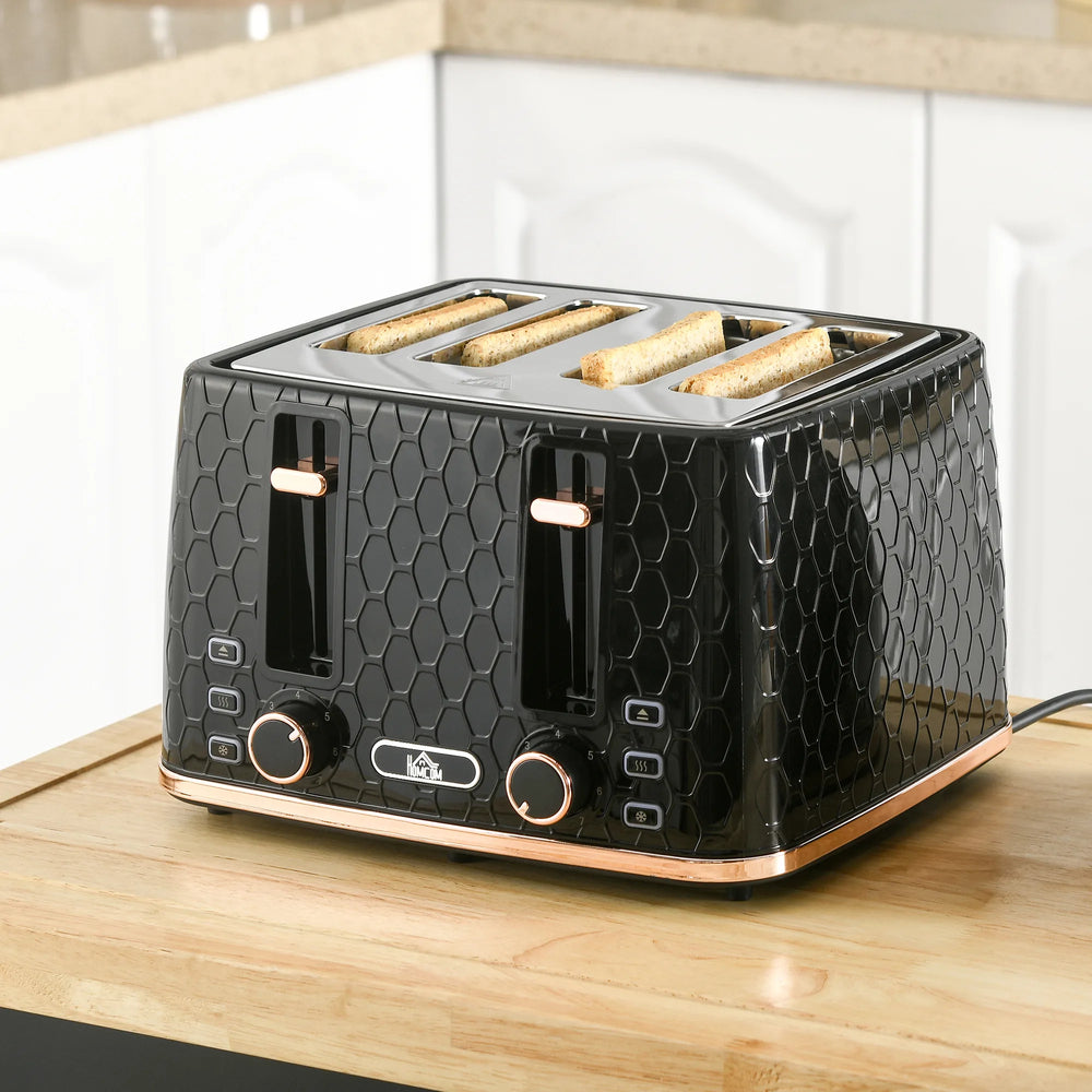 HOMCOM 4 Slice Toaster with 7 Browning Levels, High Lift, Reheat/Defrost/Cancel, Self-centring Function, Removable Crumb Tray, Auto Off, 1600W, Black Honeycomb Texture