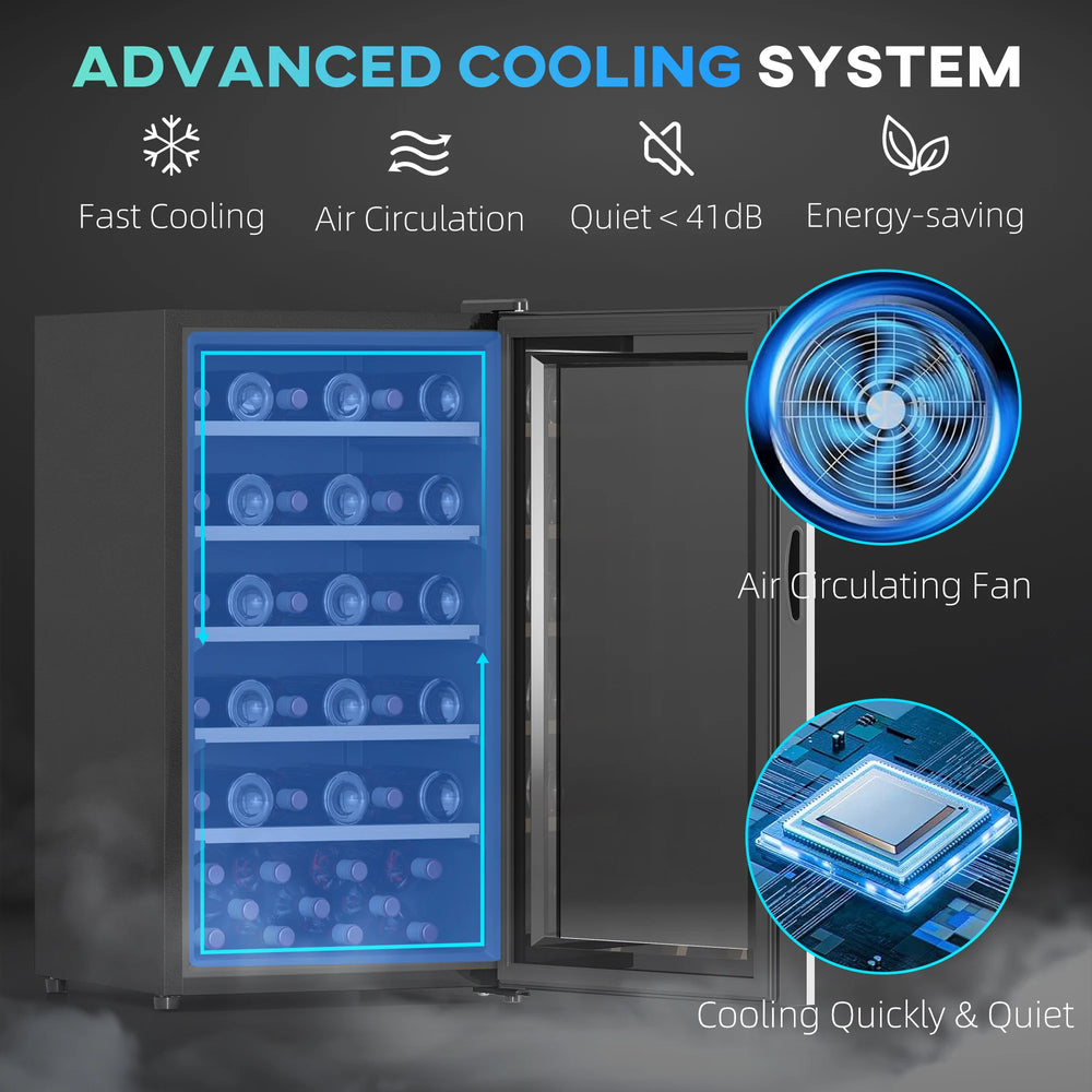 Chill your favourite tipples to perfection with the HOMCOM Wine Fridge with glass door. Precision temperature control from 5-20C lets you cater to whites, prosecco. A simple touch control and LED display ensure hassle-free operation, while the large capacity holds up to 41 bottles on stylish wood finish racks. Great for any spot from home bars to kitchens!