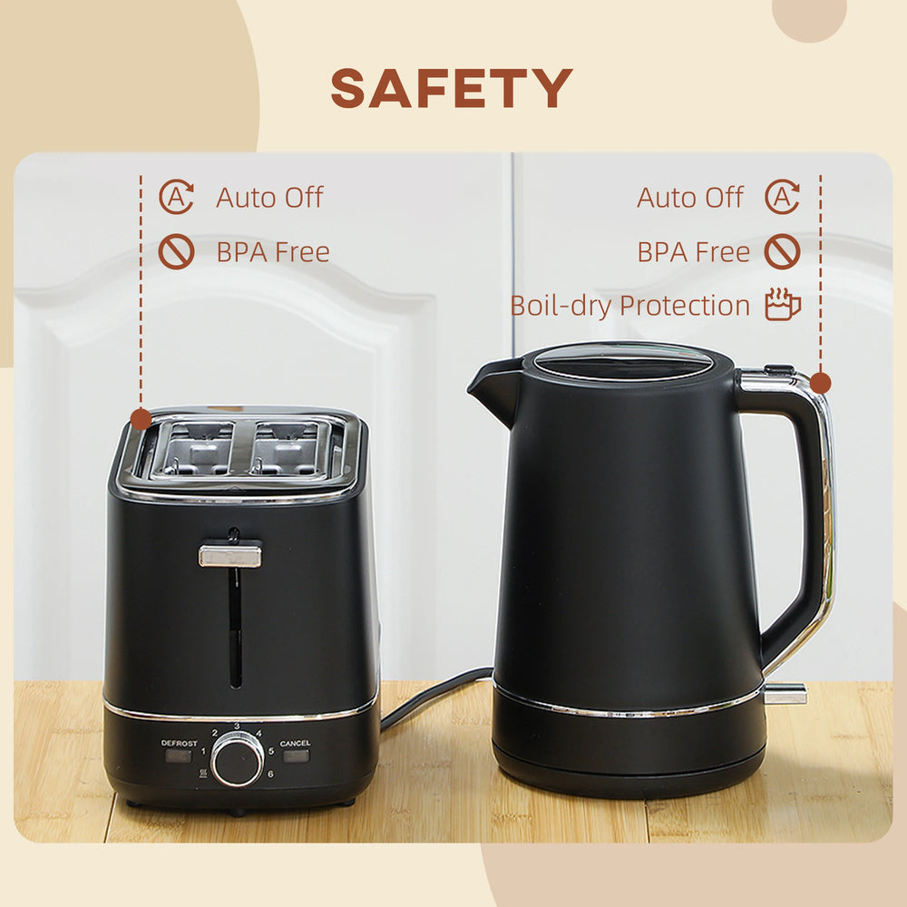 Elevate your morning routine with the HOMCOM Black Kettle and Toaster Set. This chic, modern duo includes a Fast Boil Kettle that zips to a boil in just three minutes and a versatile two slice toaster with reheat, defrost and cancle functions. Finished in sleek finish, this set not only looks smart but makes your breakfast quick and effortless. Enjoy the simplicity and efficiency of streamlined design!