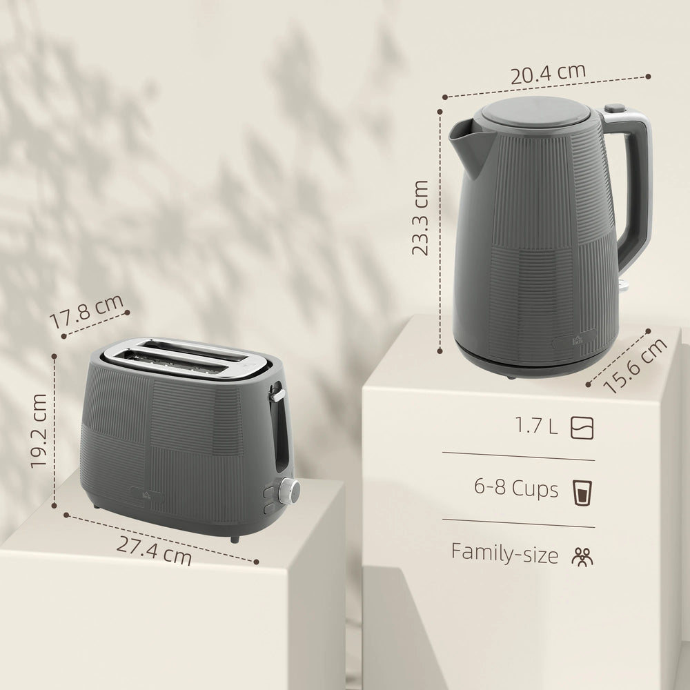 Elevate your morning routine with the HOMCOM Grey Kettle and Toaster Set. This chic, modern duo includes a 3000W electric kettle that boils a cup of water in just 42 seconds and a versatile toaster with reheat, defrost, and seven-level browning control. Both items feature safety auto-shutoff and are designed for easy use and cleaning, ensuring a seamless breakfast experience.
