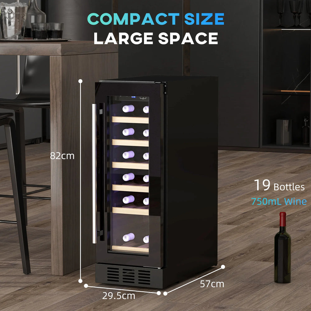 Chill your cherished bottles to perfection in this HOMCOM wine fridge. Six full-length, and beautiful, wooden racks hold 19 bottles; also adjustable to fit larger bottles when needed. Adjust the temperature between 5-18C to find the coolness best for you. Complete with a double glass door, which is also resistant to damaging UV rays.