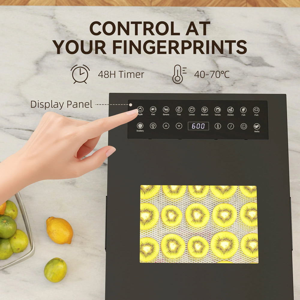 - 12 pre-set programmes: A quick and easy way to set food dehydrator to suit different foods. Easily create beef jerky, dried fruits, vegetables, mushrooms, pet treats and more.