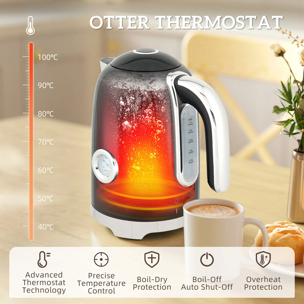 - Otter thermostat and thermometer: See the temperature of the kettle as it boils. Thermostat ensures auto shut-off, boil-dry and overheat protection - safety and peace of mind.