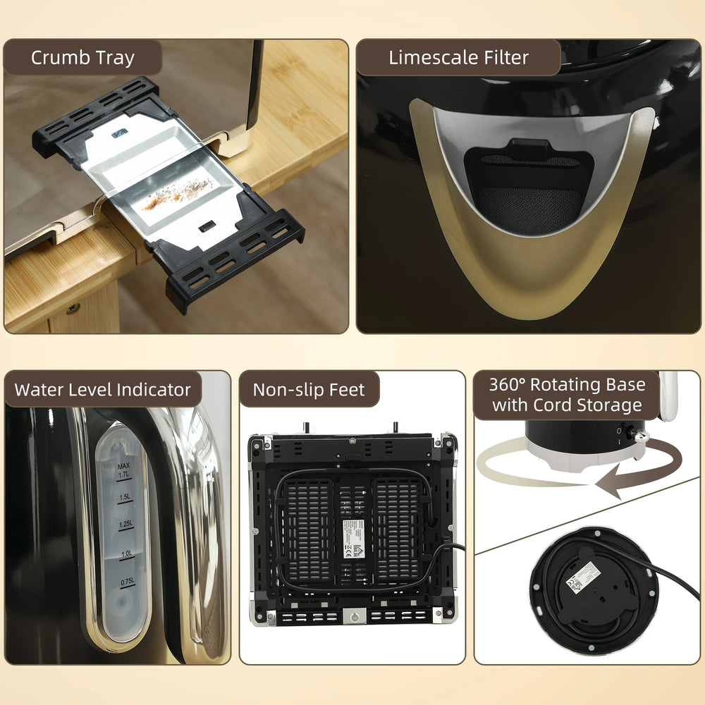 - Removable crumb tray and limescale filter: Easy to keep kettle and toaster set clean and functioning to its best.
