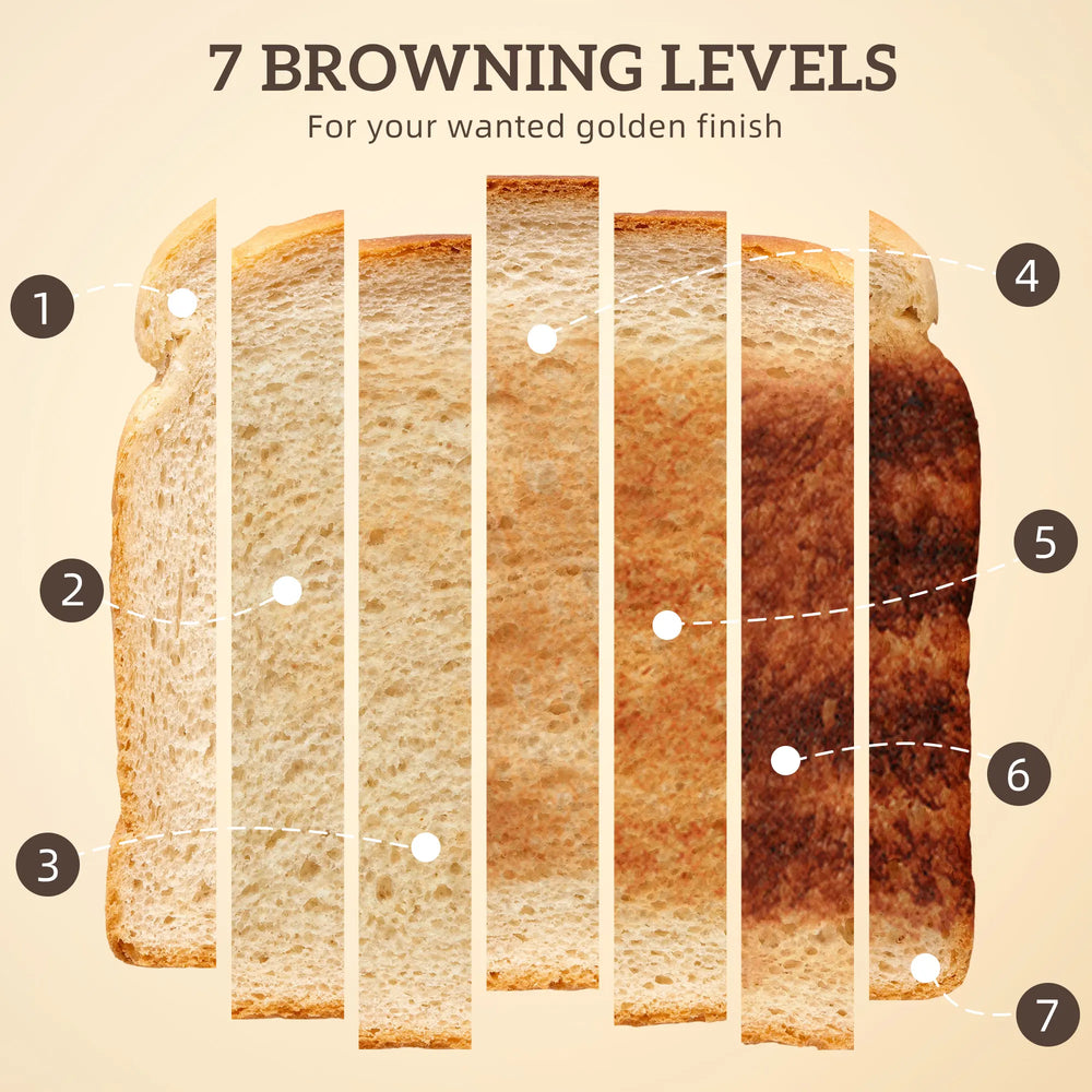 - Four-slice toaster: With dual controls and 7 browning settings plus defrost, reheat, and cancel functions, this toaster delivers delicious results every time. 3.5 cm wide slots fit all slices, with auto-centring and pop-up lift for easy, even toasting