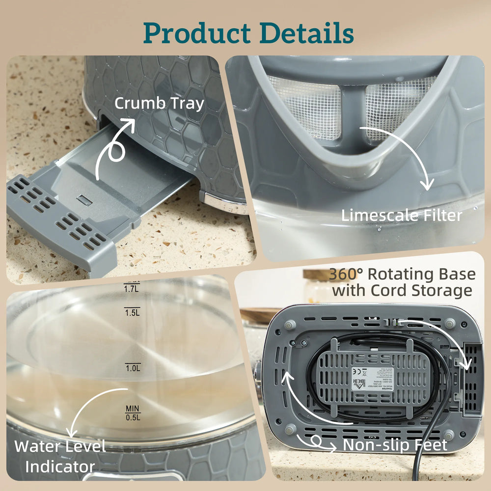 - Breakfast ready in one go, for the whole family: This 2-slice toaster pairs with a 1.7L fast-boil kettle to prepare toast and hot drinks together. It's suitable for busy mornings, helping everyone enjoy a warm and satisfying breakfast