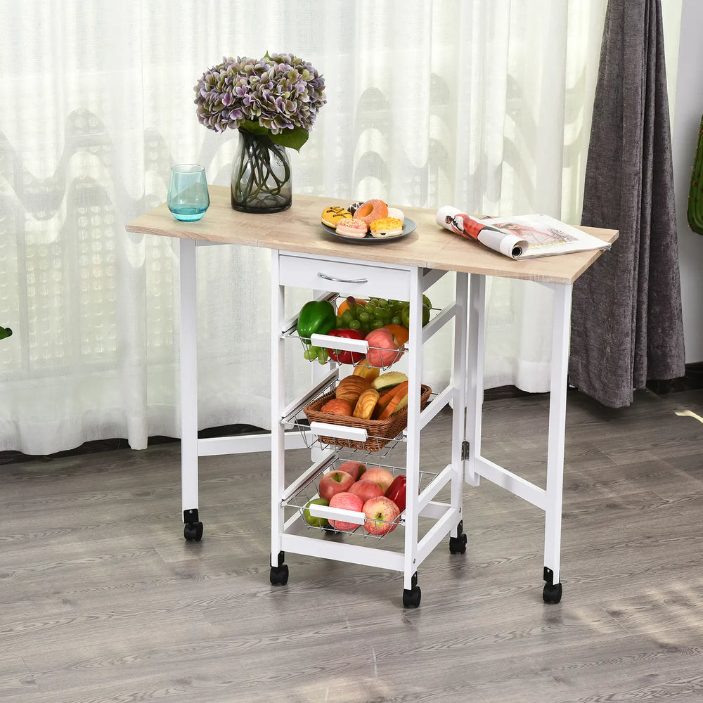 HOMCOM Drop-Leaf Kitchen Cart Trolley w/ 3 Baskets Drawer Surface Top 6 Universal Wheels Rolling Storage Unit Kitchen Home Dining Island White Oak Tone