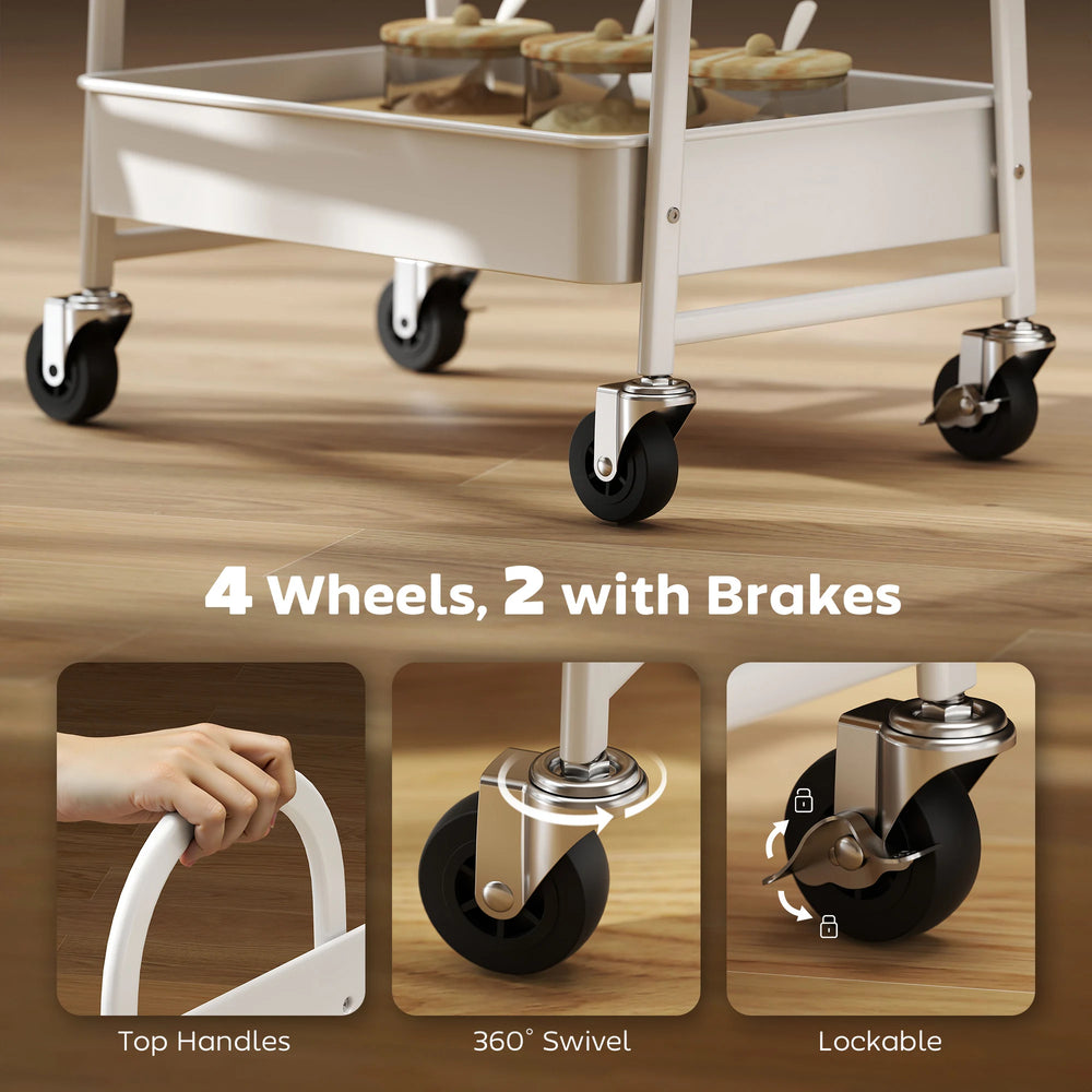 - Smooth mobility: Featuring four 360 swivel wheels, including two with brakes, this kitchen trolley glides effortlessly into placeand locks securely when needed. Top curved handles make it more convenient to push and pull around