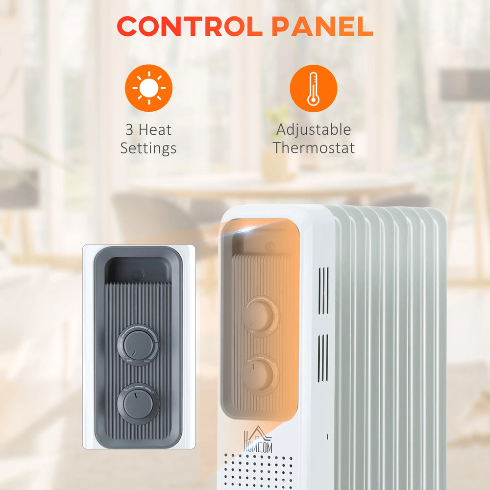 HOMCOM 2000W Oil Filled Radiator, 9 Fin, Portable Electric Heater with 3 Heat Settings, Safety Cut-Off and Wheels, White