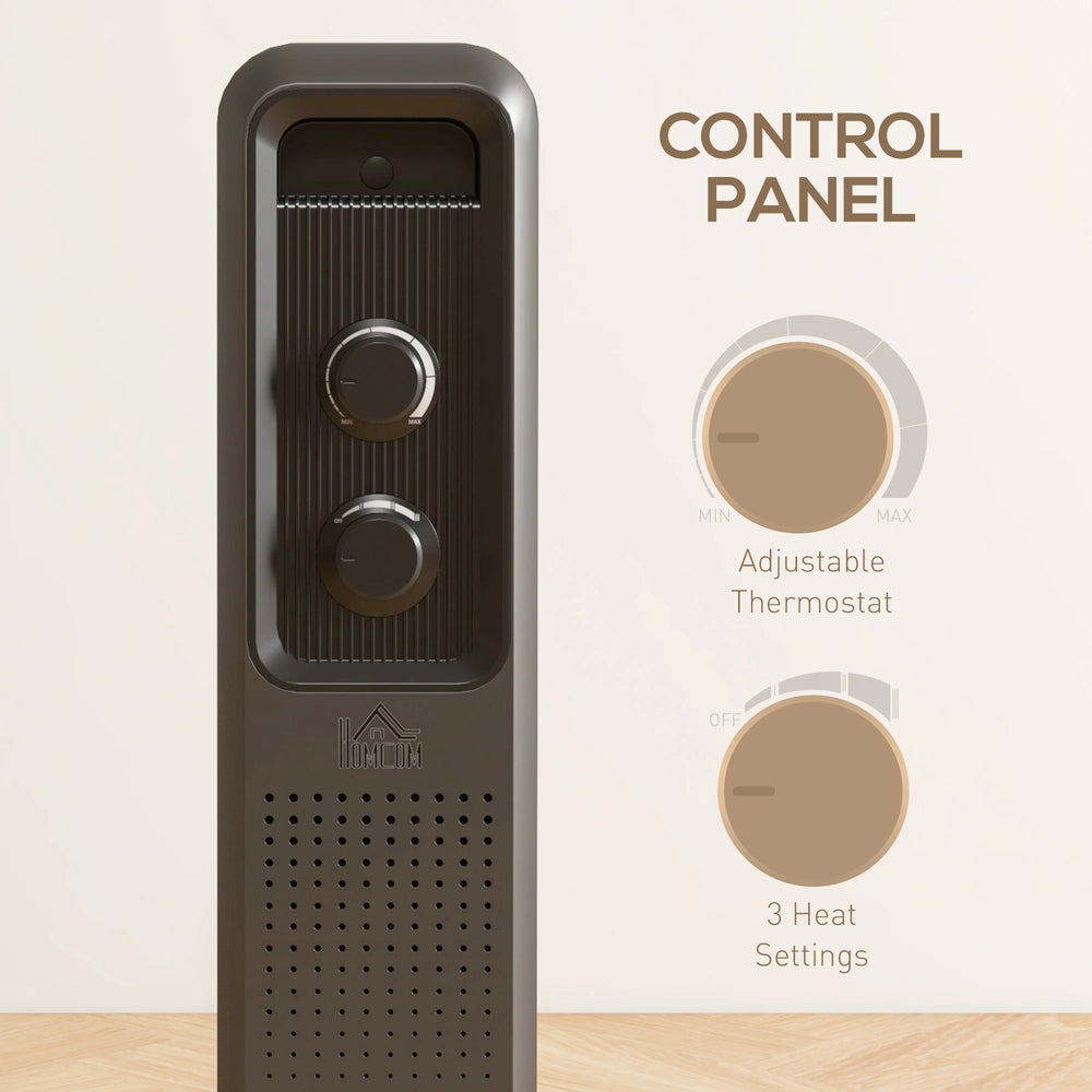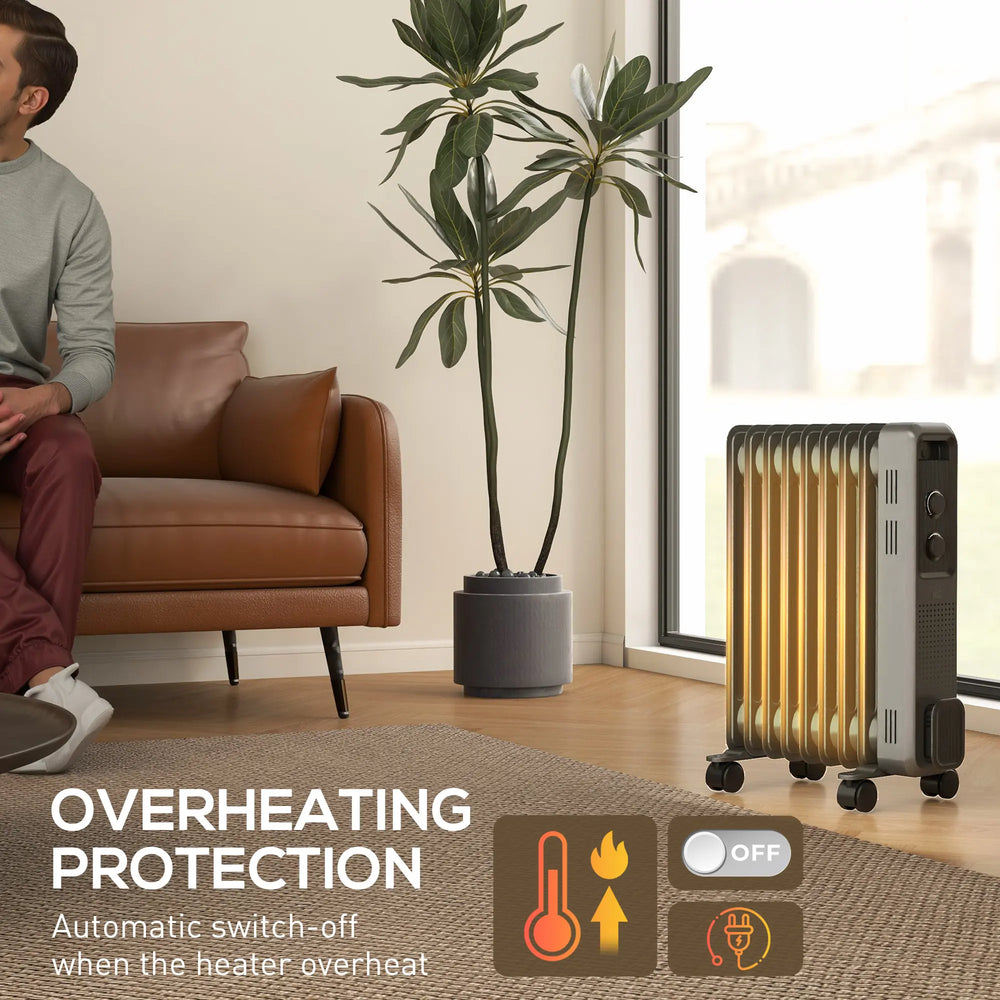 HOMCOM 2000W Oil Filled Radiator, 9 Fin, Portable Electric Heater with 3 Heat Settings, Safety Cut-Off and Wheels, Grey