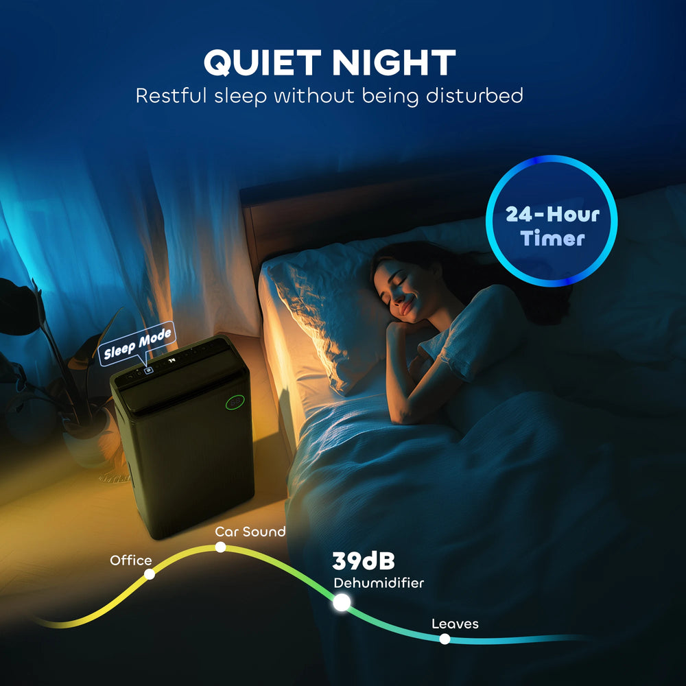 - Two speeds and five modes: dehumidification/continuous dehumidification/dryer/fan/sleep