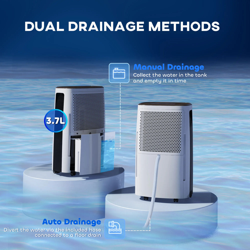- Removes up to 16L a day, for 15-20m2 spaces: 3.7L tank in dehumidifier for home damp removes plenty, with continuous drain option so it continues to work until it's full. Works best in 7-35C temperatures, with moisture above 40%.