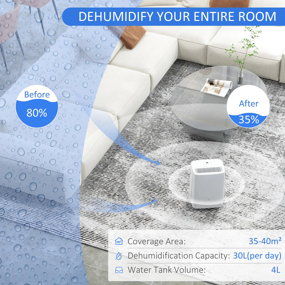 - Efficient moisture removal: This dehumidifier for home efficiently removes up to 30L of moisture per day, based on above 35% humidity in 7-35C. Its removable 4L water tank and a drainage hose for sustained operation. A good choice to remove moisture, and prevent damp wall or furniture, extend the shelf life of food.