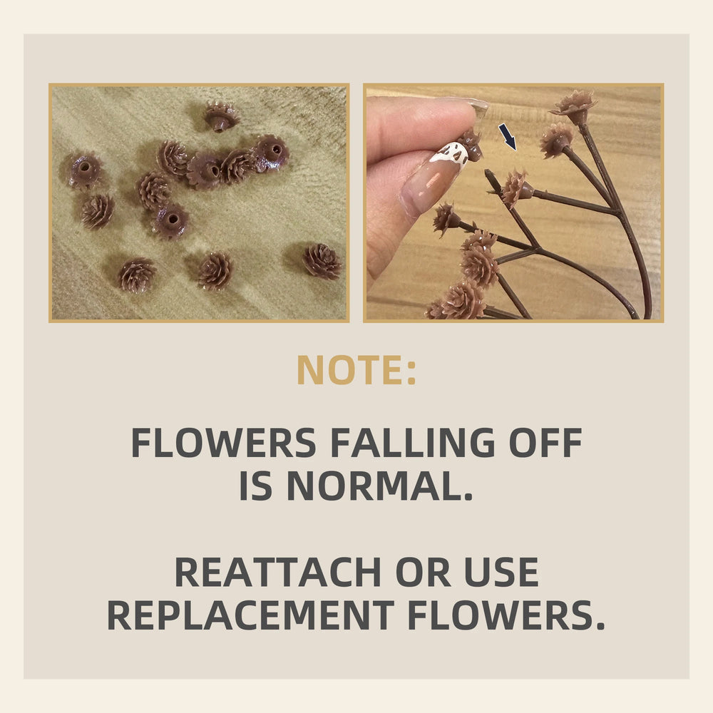 - Note: Flowers falling off is normal. Reattach or use replacement flowers