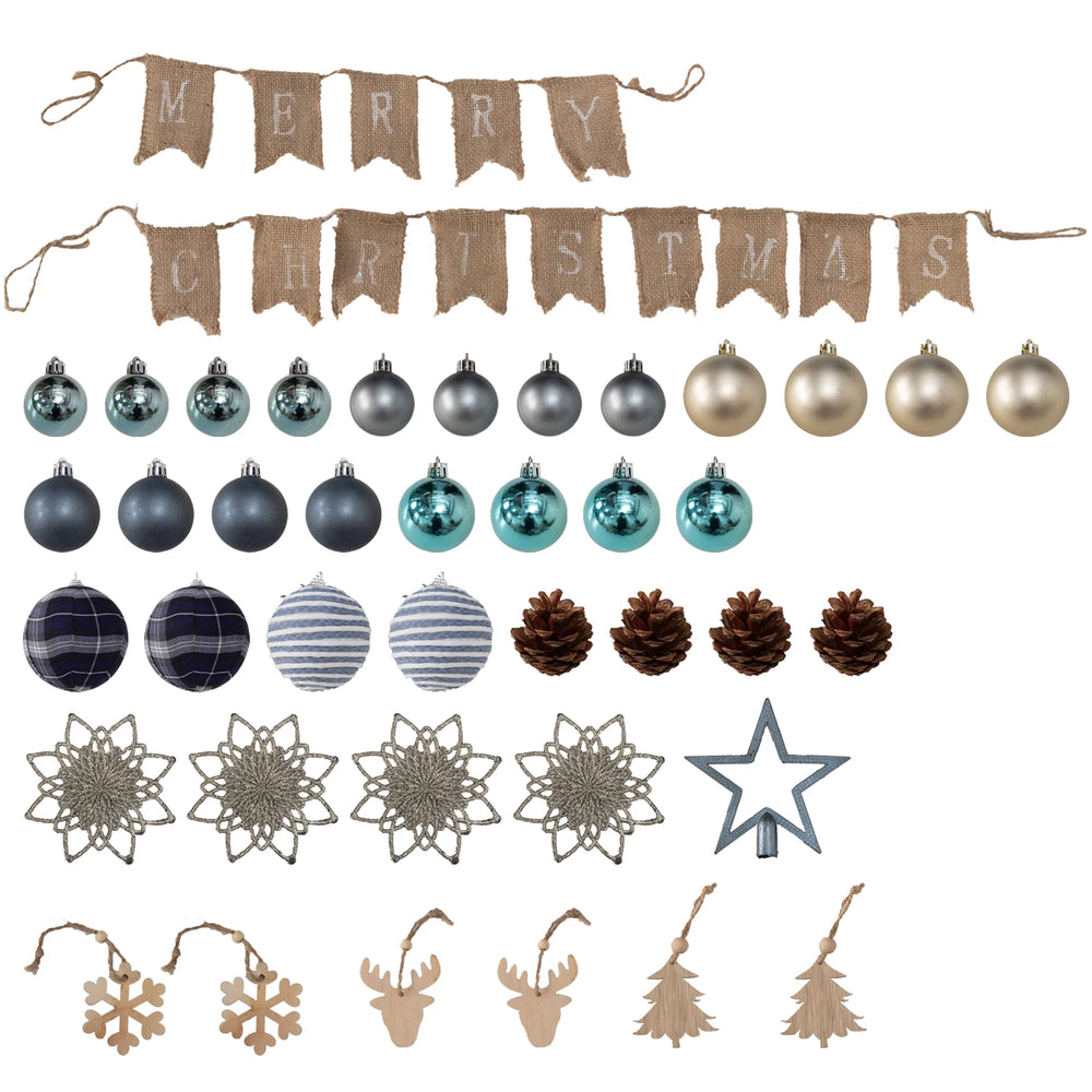 - Provide with MERRY CHRISTMAS ribbon, top star, pine cones and decorative balls