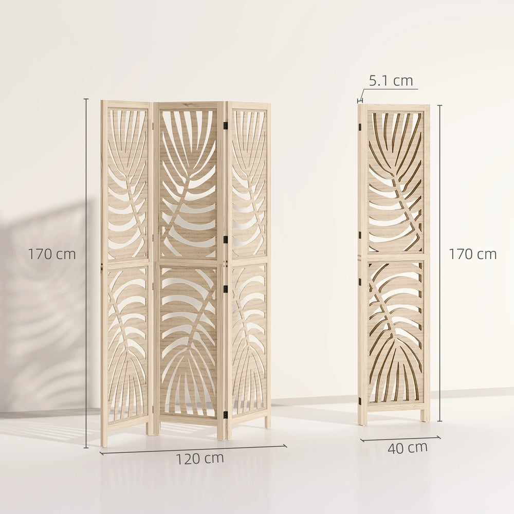 HOMCOM 3 Panel Room Divider, Detachable Folding Privacy Screens with Palm Leaf Design for Home Office, Natural Wood Finish