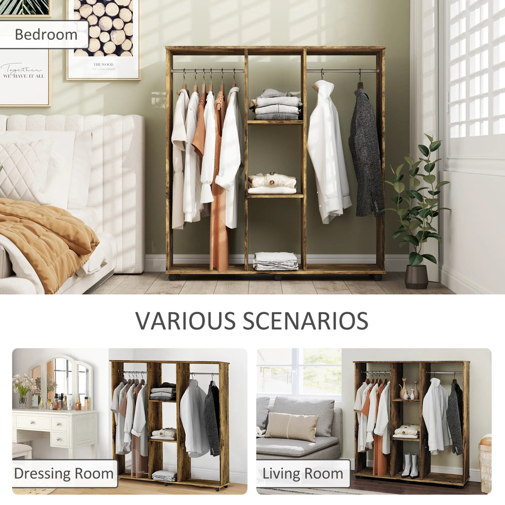 HOMCOM Open Wardrobe Double Mobile Storage Shelves Organizer W/6 Wheels-Rustic Brown