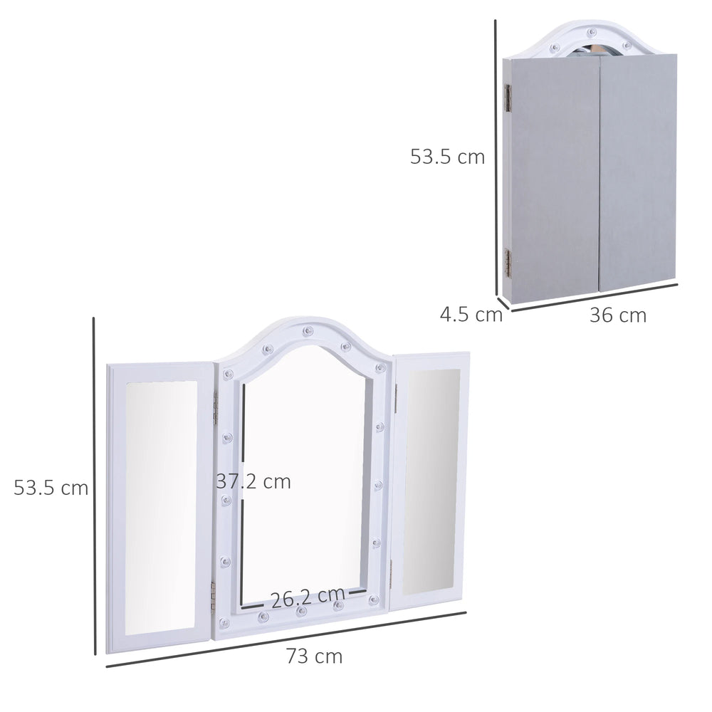 HOMCOM Trifold Freestanding Mirror, Lighted Tabletop Vanity Mirror Large Cosmetic w/16 LED Lights powered by batteries Foldable For Bedroom- White