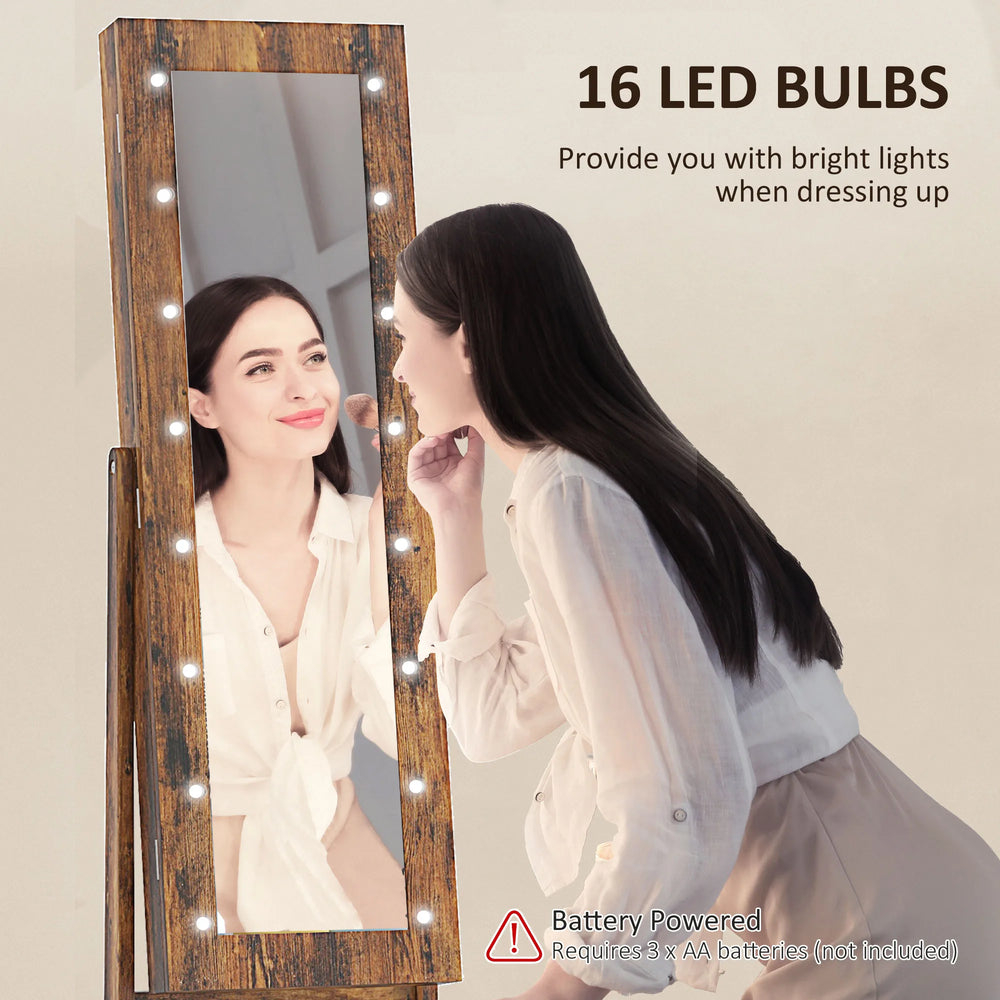 Keep jewellery, makeup and more organised with this HOMCOM freestanding mirror cabinet. It features a longline mirror, surrounding by 16x LED lights - illuminates the mirror so you can ready even in the dark. Open to door to discover 70x ring slots, 32x earring pair slots, 12 hooks and three shelves - plenty of room for keeping all make-up and beauty essentials together.