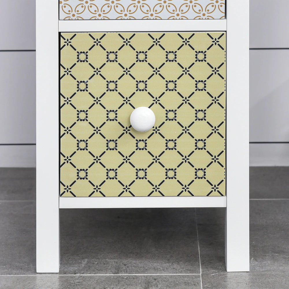 - PATTERNED: Different design on bathroom storage drawers for a contrasting and striking look. Bright and lively to bring colour around where it stands.