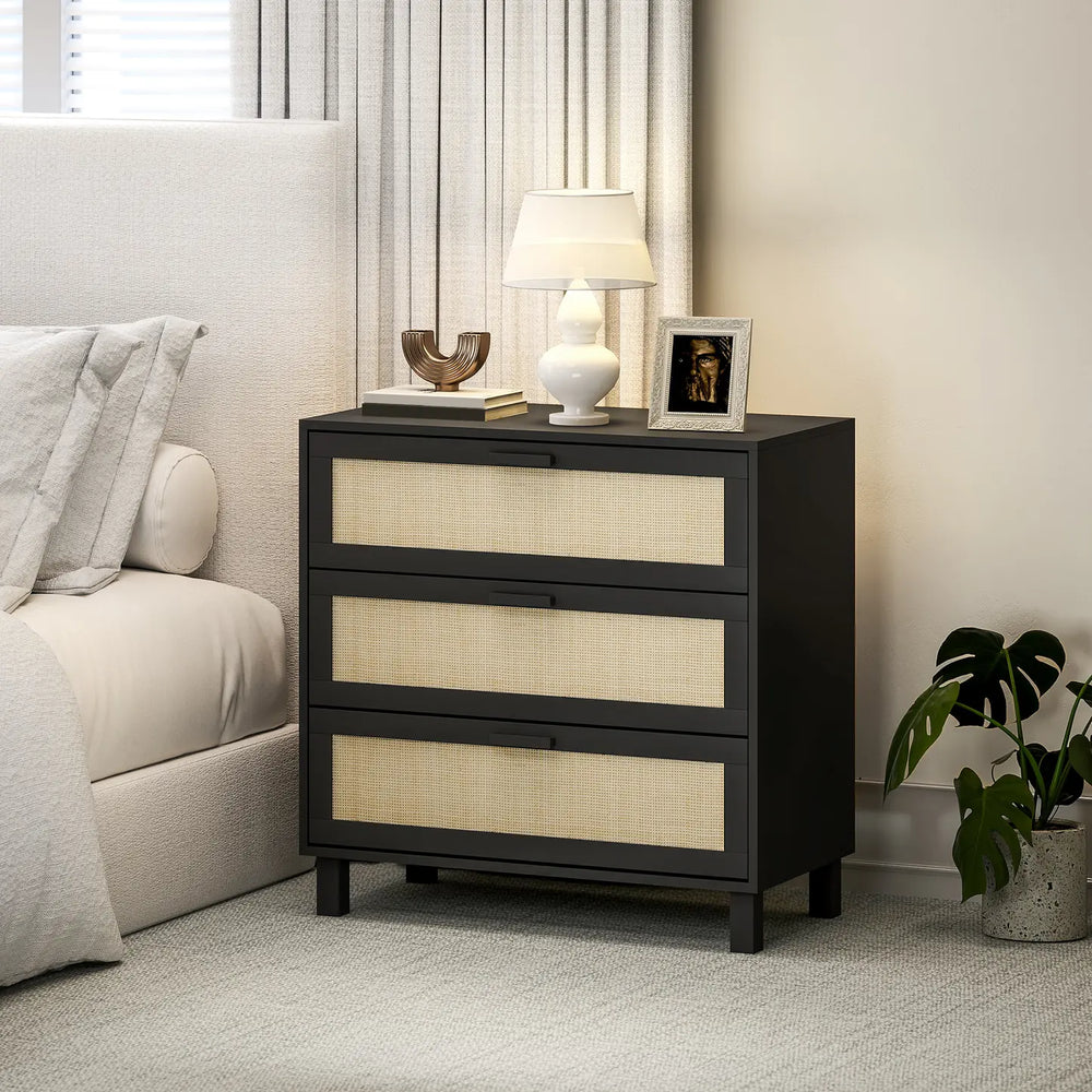 HOMCOM Rattan Bedroom Chest of Drawers, 3 Drawers Storage Unit, Boho Dresser for Living Room, Hallway, Black is backordered and will ship as soon as it is back in stock.
