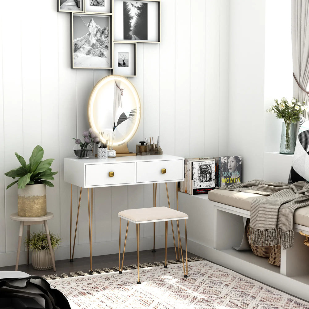 - TWO-PIECE SET: Formed of the dressing table and matching stool. Table is made from sturdy and resilient MDF. Stool filled with sponge padding for comfort. Metal legs in golden colour create a luxury look.
